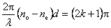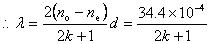 例题12-16-1 在两个偏振化方向相同的偏振片之间平行地插入一厚度d = 0.01mm的波片,其光轴方向与偏振化方向之间夹角为。以白光入射,出射光中缺少那些波长的光?(设对于可见光范围的所有波长有no – ne = 0.172)